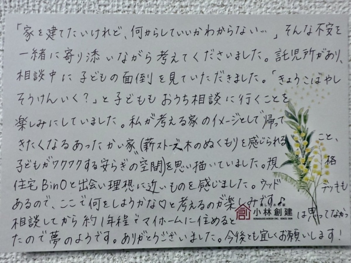 K様、BinO LOAFERでの住まいづくりを小林創建にお任せいただき、誠にありがとうございました。