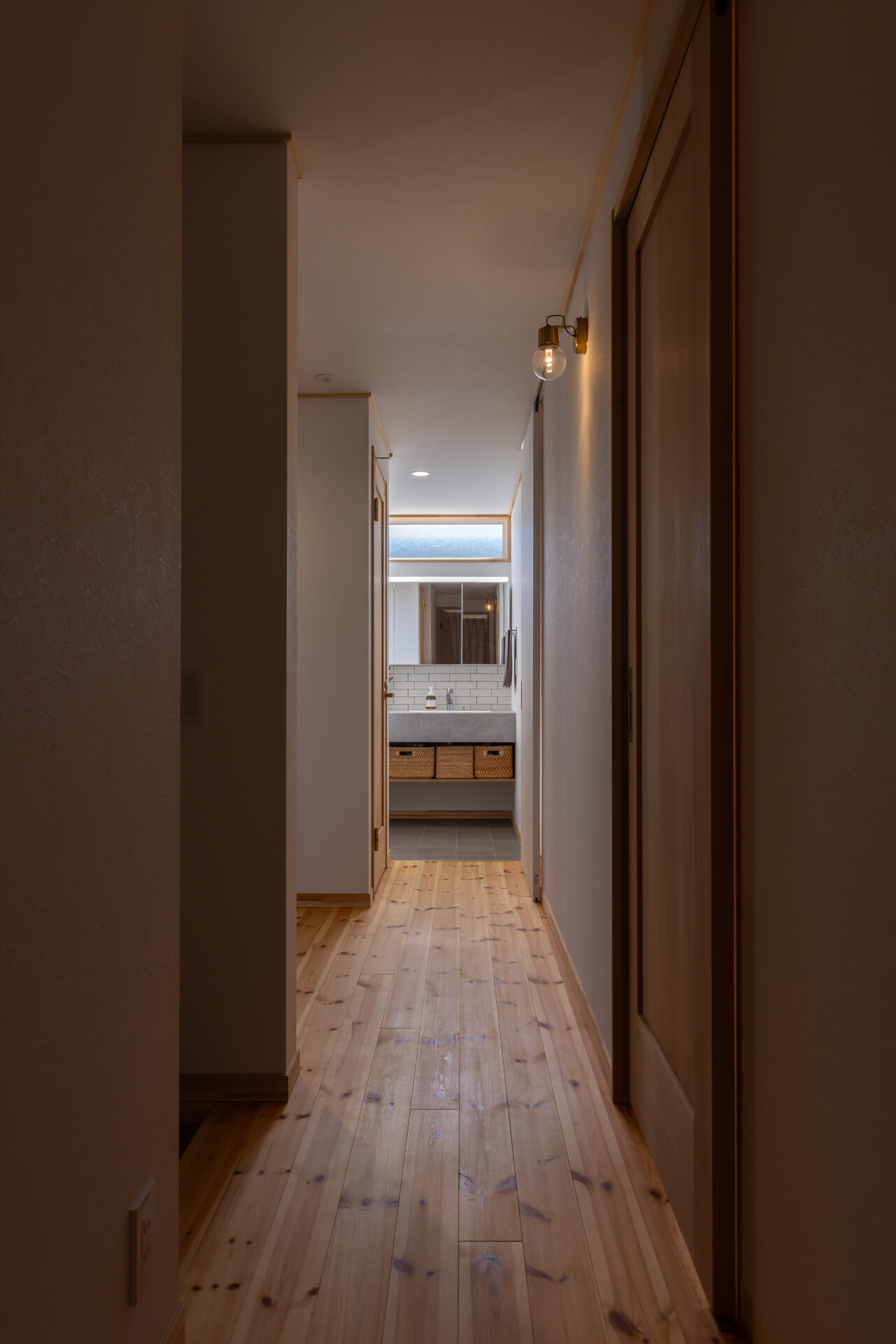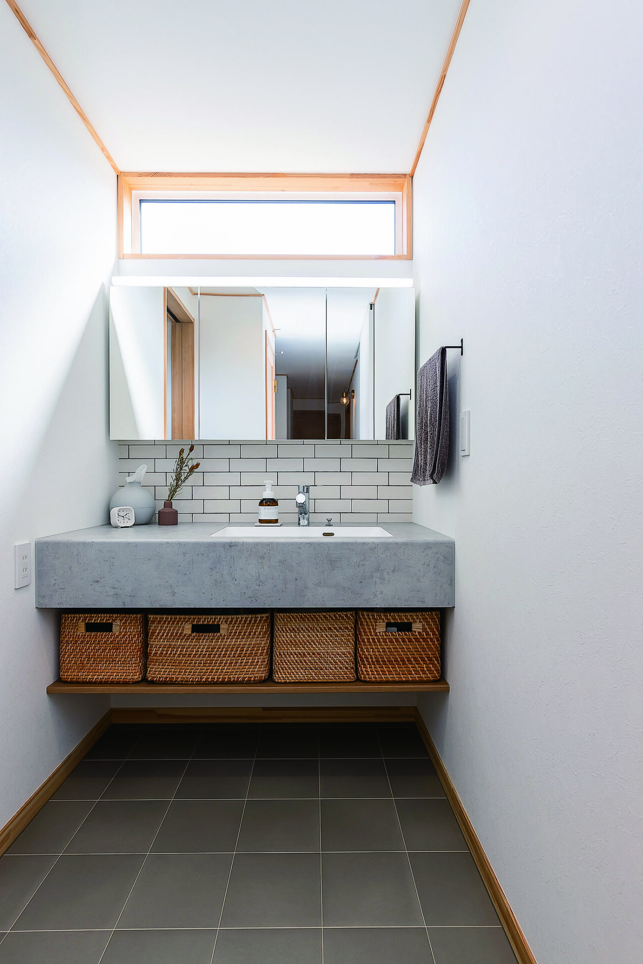 造作の洗面台は、ふたり並んでも使いやすいように、広々としたスペースを確保。高窓から自然光が降り注ぎ、明るく清潔感のあるスペース