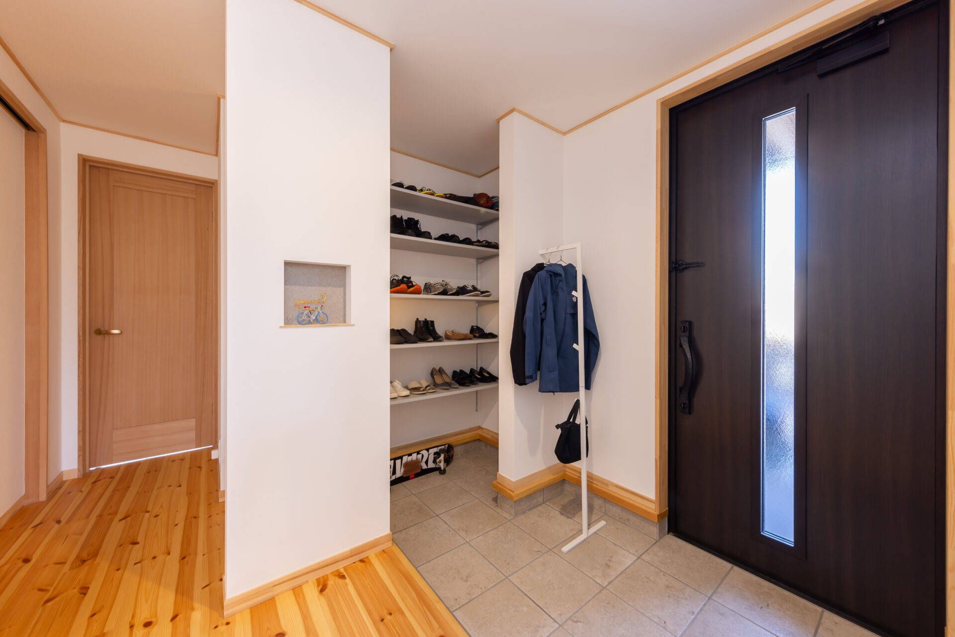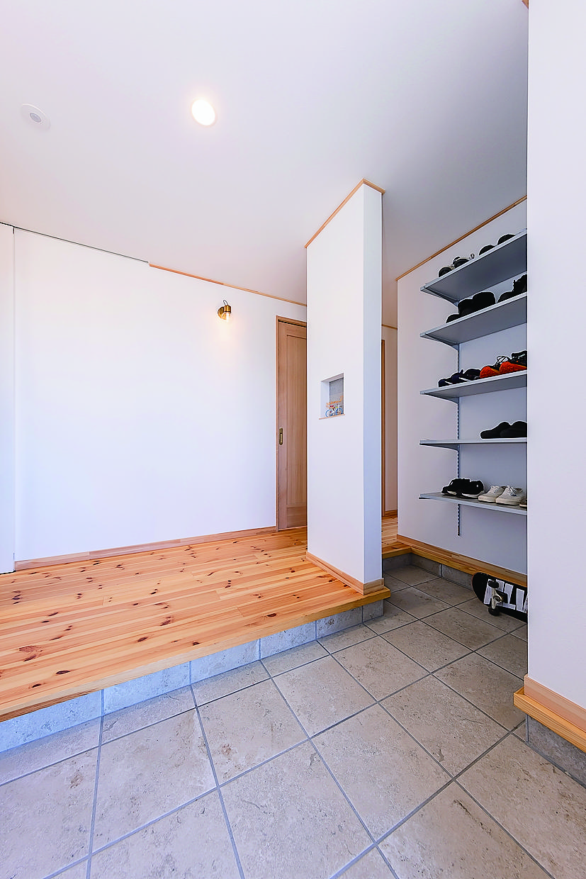 玄関の北側はセミオープンのシューズクロークに。来客からは見えにくいが、収納力は十分