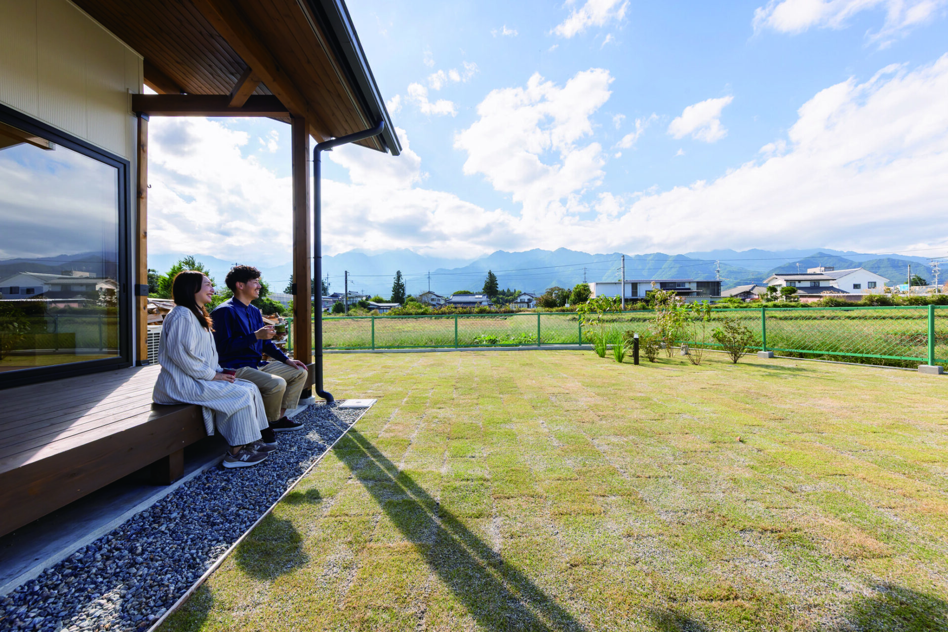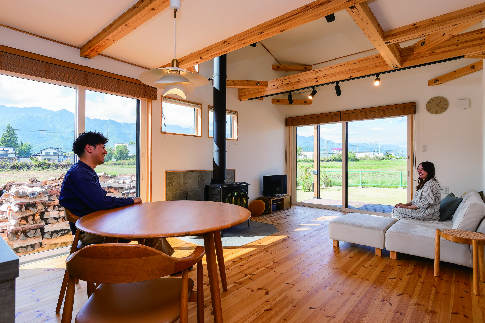 「キッチンで家事をしながら、雄大な山々を見られるのが幸せ」と顔を見合わせるご夫妻。ふと窓に目をやると堂々とした北アルプスが目に入る。”大好き”に囲まれる日々は、これから家族が増えていっそうにぎやかになりそうだ。