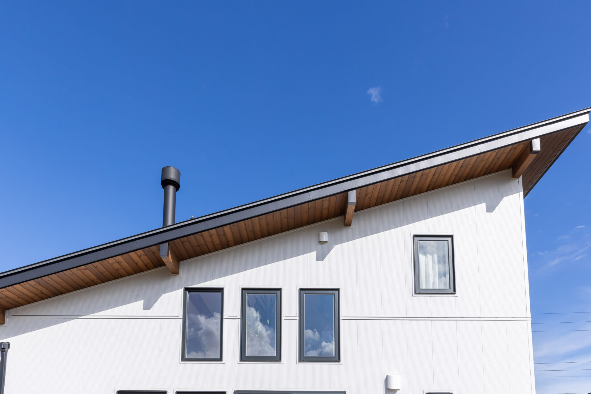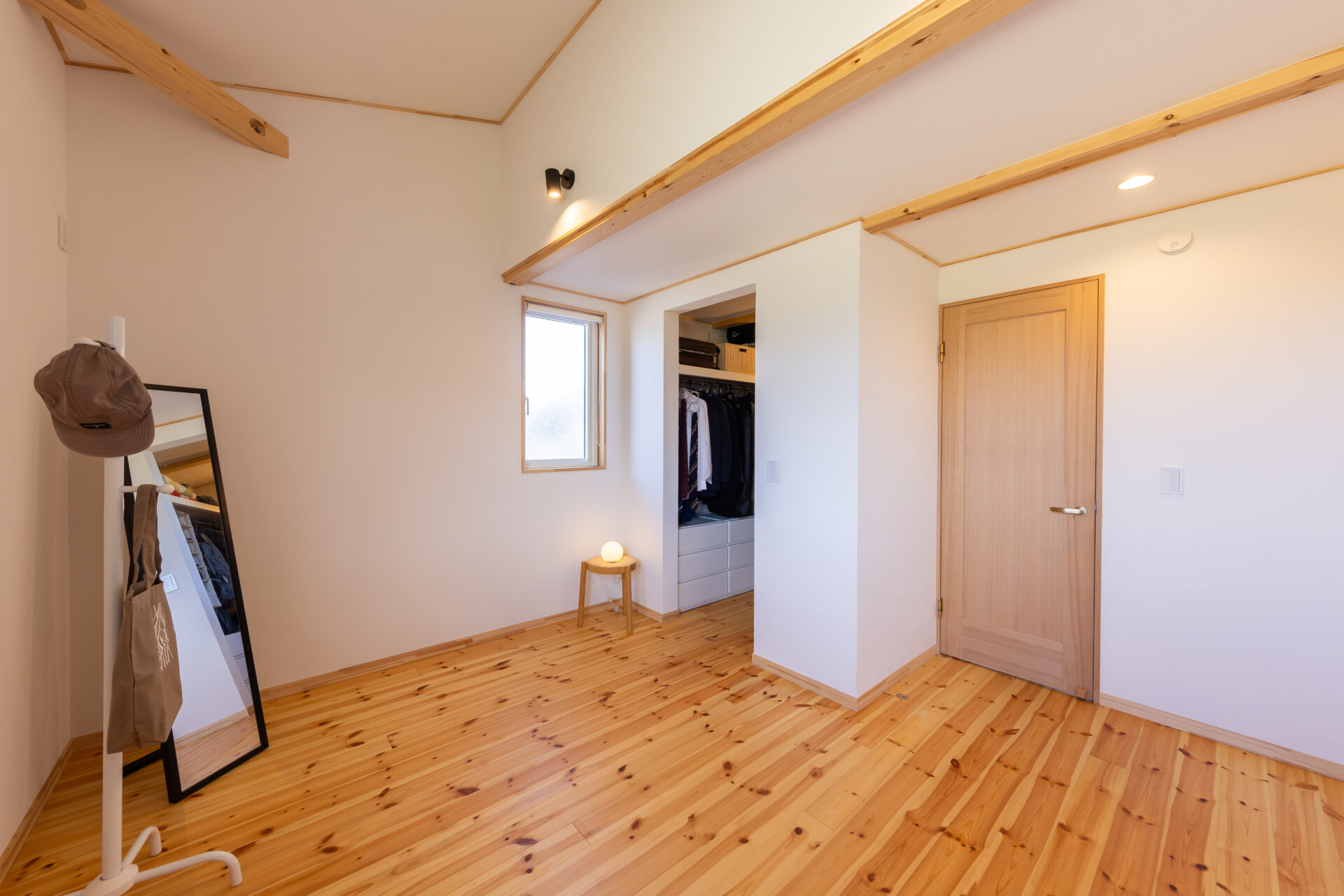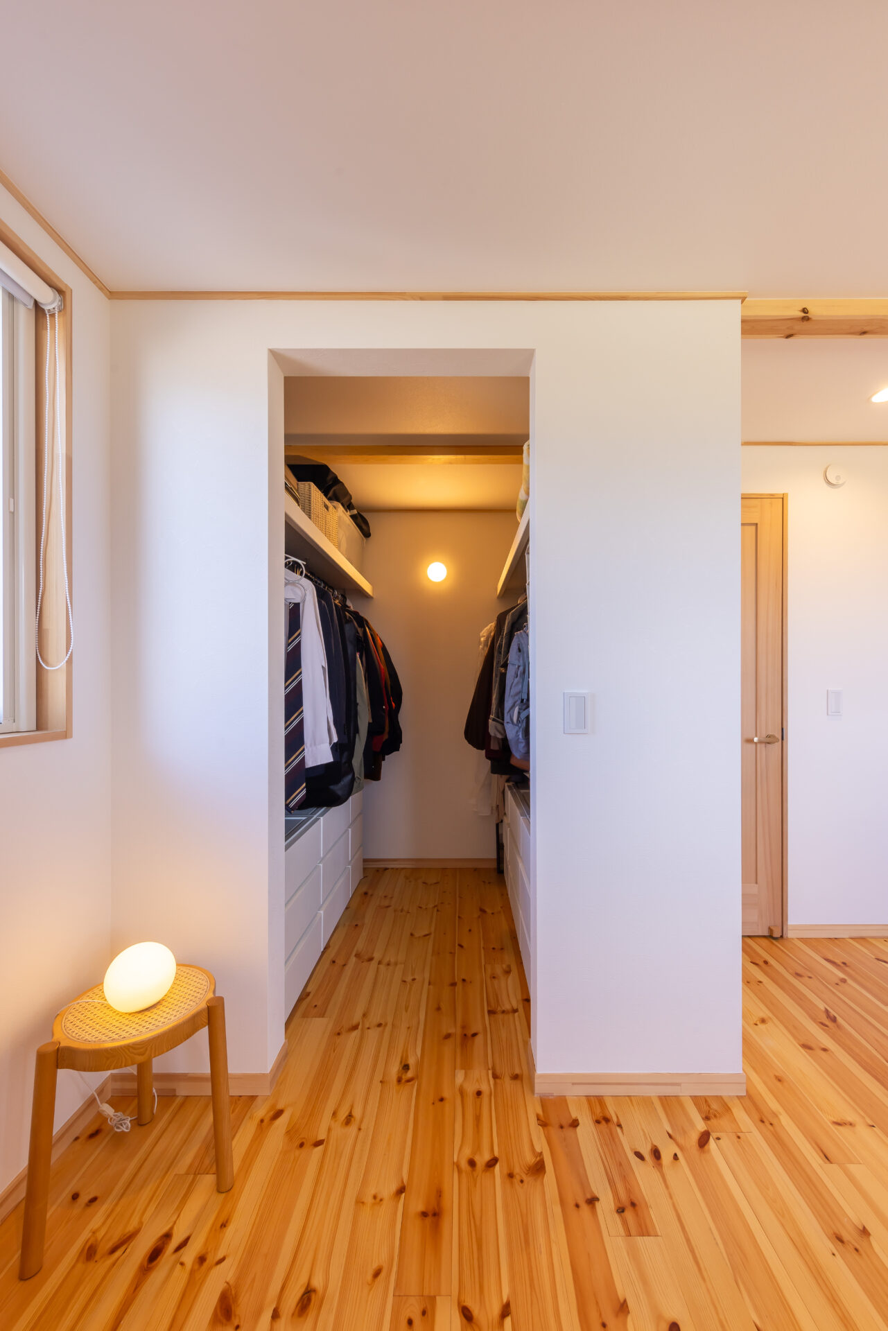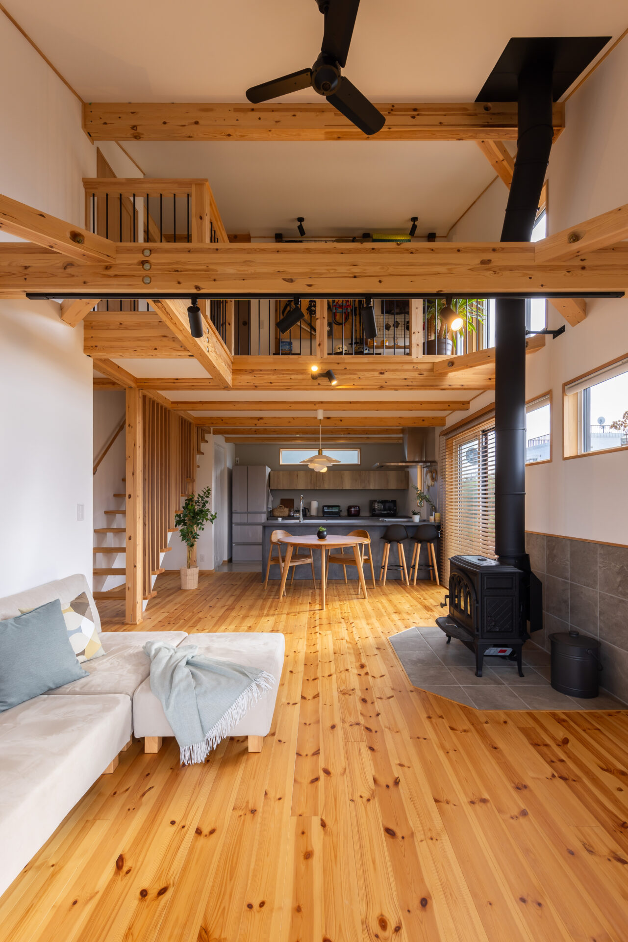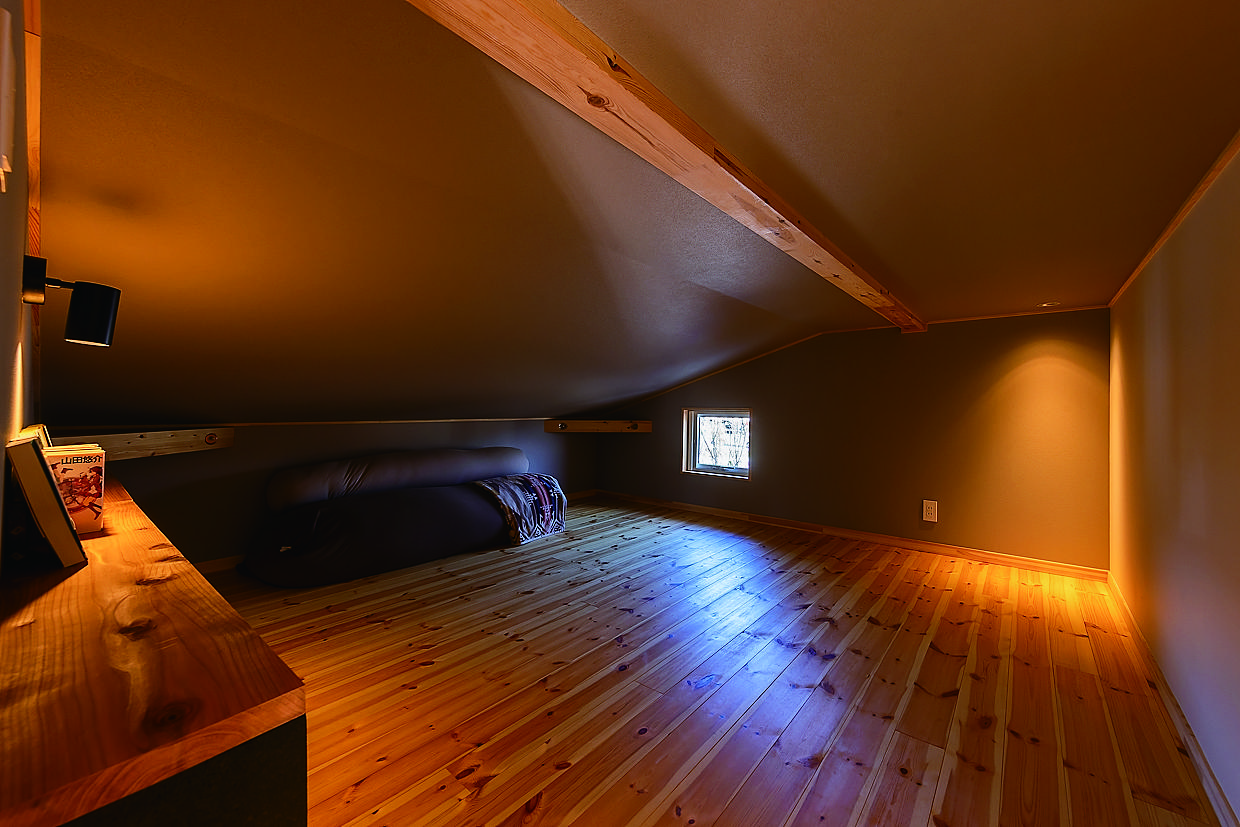 選んだのは、平屋+αのロフトハウスBinO 「ローファー」。無垢床やオリジナル建具といった良質な素材を用いつつ、規格化することでコストカットを可能にしている。K邸で特筆すべきは、規格のプランを180度回転させて南北を逆にしたこと。これにより「山を眺める」を実現できたほか、南をあえて閉じることで近年の夏の暑さ対策にも功を奏する。ご主人念願の薪ストーブは、LDKの西側に設置。「冬は雪山と炎を堪能できて、最高の雰囲気」とほほ笑む。さらに「構造的に動かせない柱や壁に影響が無ければ、比較的自由に間取り変更できてとても良かった」とも。脱衣と洗面スペースを分けるために浴室を東側へ張り出させたり、もともと無かった玄関の土間収納を盛り込んだのがその一例だ。