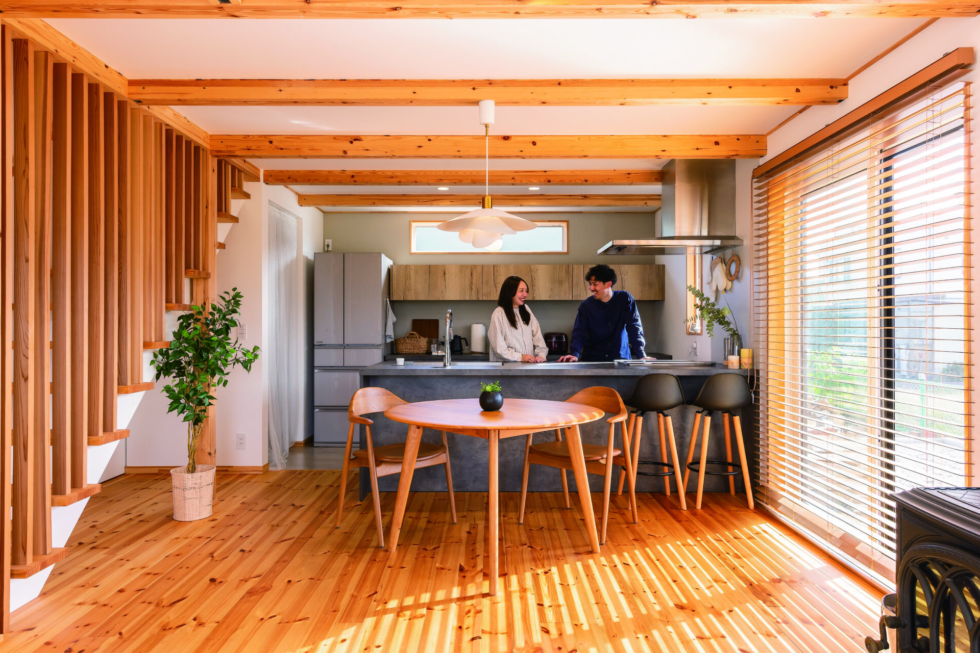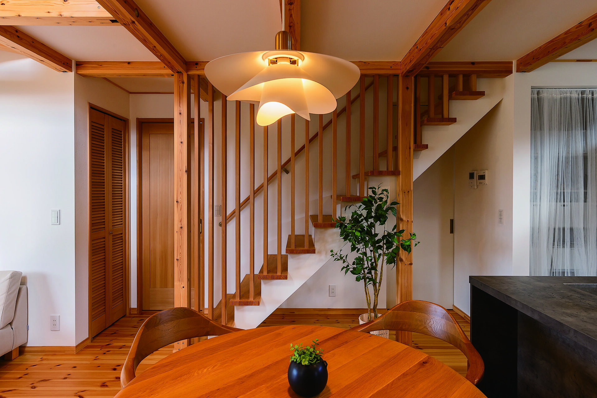 ベースプランでは階段は壁で仕切られていたが、抜け感を出したいと希望して格子に。ダイニングのペンダントライトは、奥さまが選んだVinkaのもの