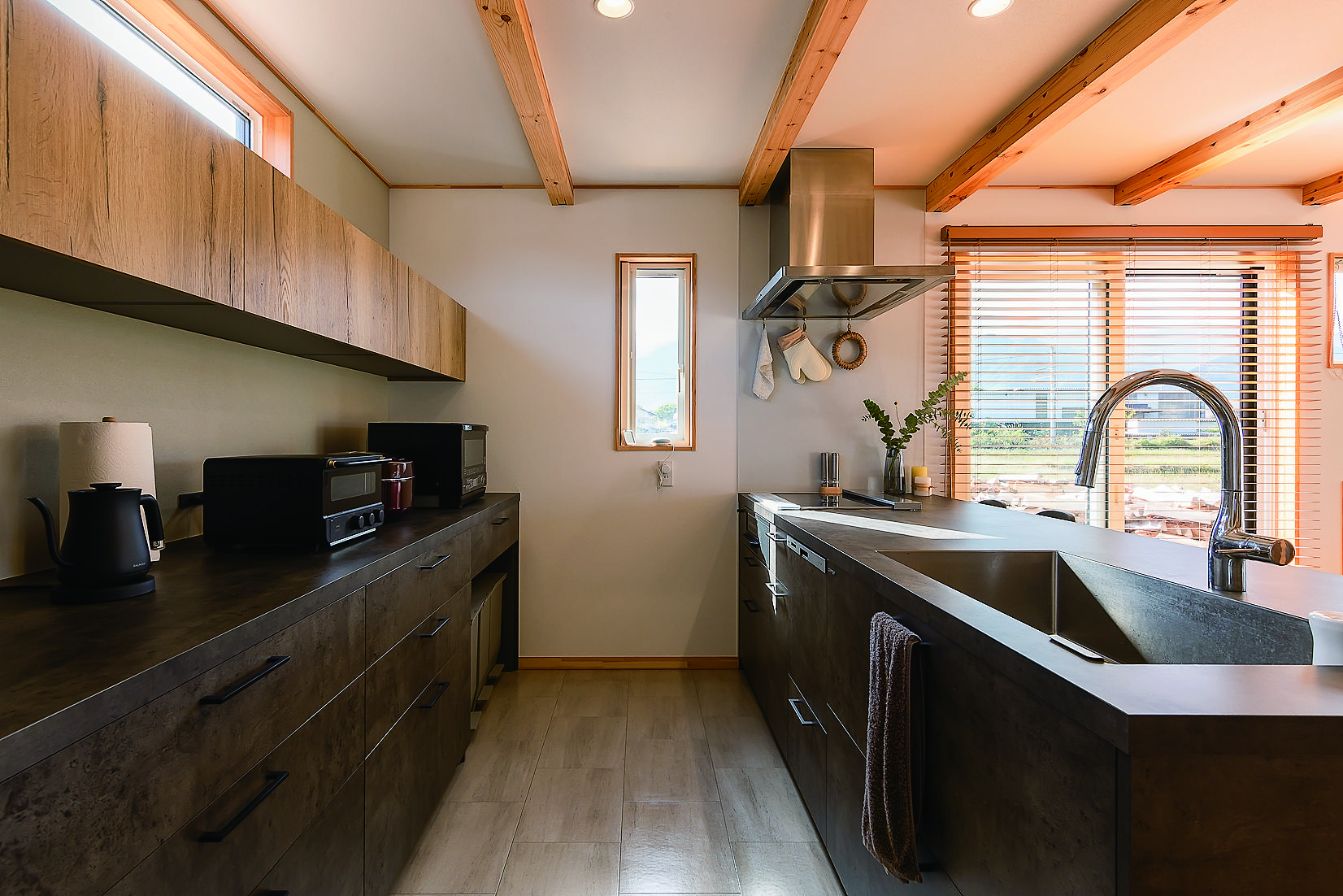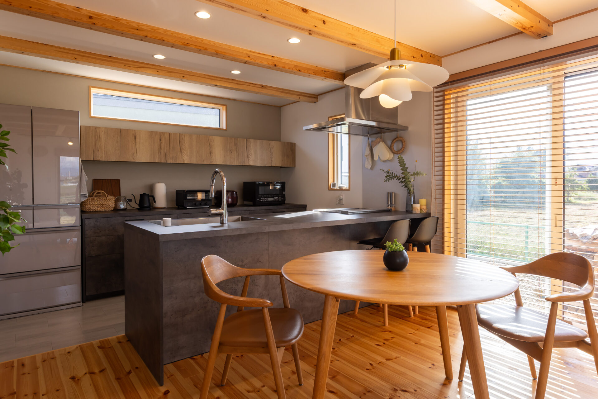 北アルプスを望む北と西に大きな掃き出し窓を設え、南側はあえての高窓のみに。木の温もりが心地良い空間に、シックなGRAFTEKTのキッチンが映えるナチュラルモダンなLDKKさんご夫妻の共通の趣味は山登り。「山頂から四方を見ると、普段は見えない奥の山々まで眺められるのが爽快」と話す奥さまに、「ご褒美は、山頂で眺めるキレイな星。それを見ながらのビールも美味しいし、ご来光も楽しみ」と話すご主人。「担当の営業さんも山がお好き。『北アルプスを一望できる家』という要望を汲み取ってくれたことが小林創建さんを選ぶ決め手になりました」との言葉通り、家の中の至る所から山並みを眺められる。