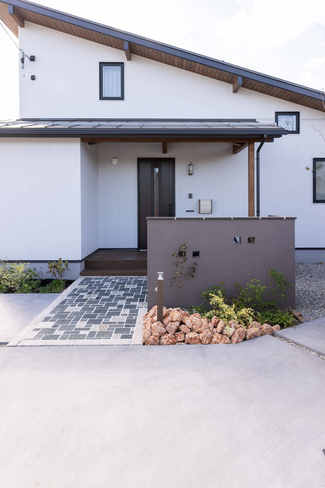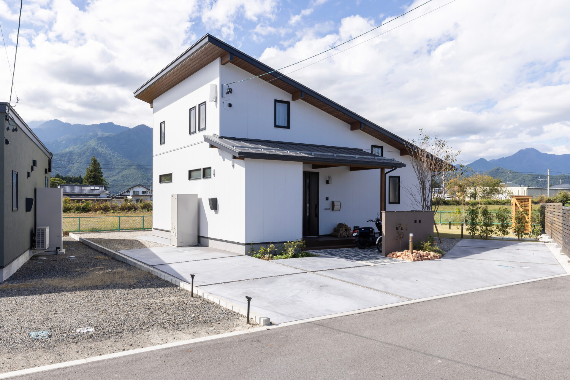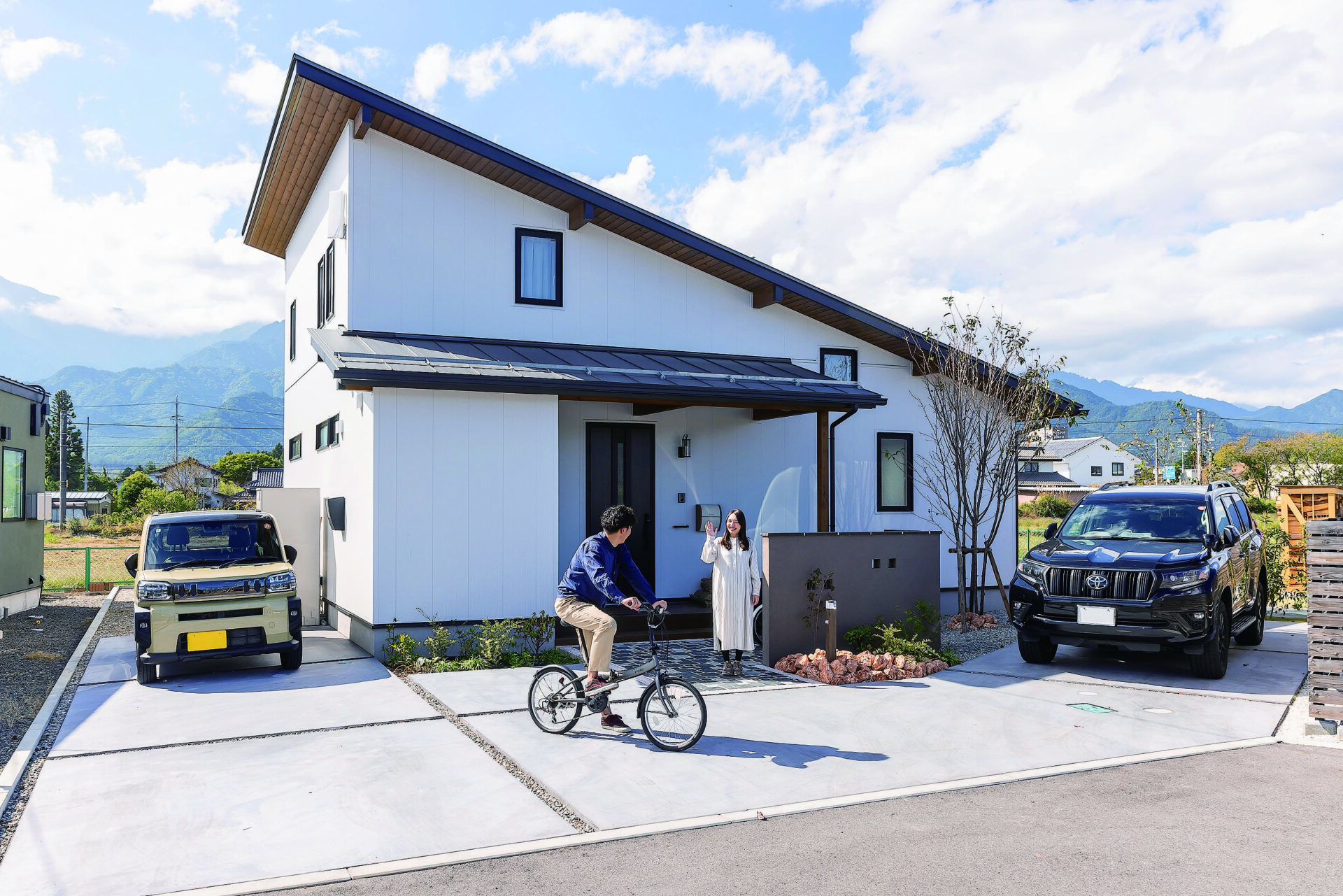 白い外壁のアクセントは、黒い屋根と窓枠。愛らしい印象の外観と調和した外構にも目が留まる。「規格住宅を選んだおかげでコストを抑えられ、外構工事に予算を回せたのもメリットです」