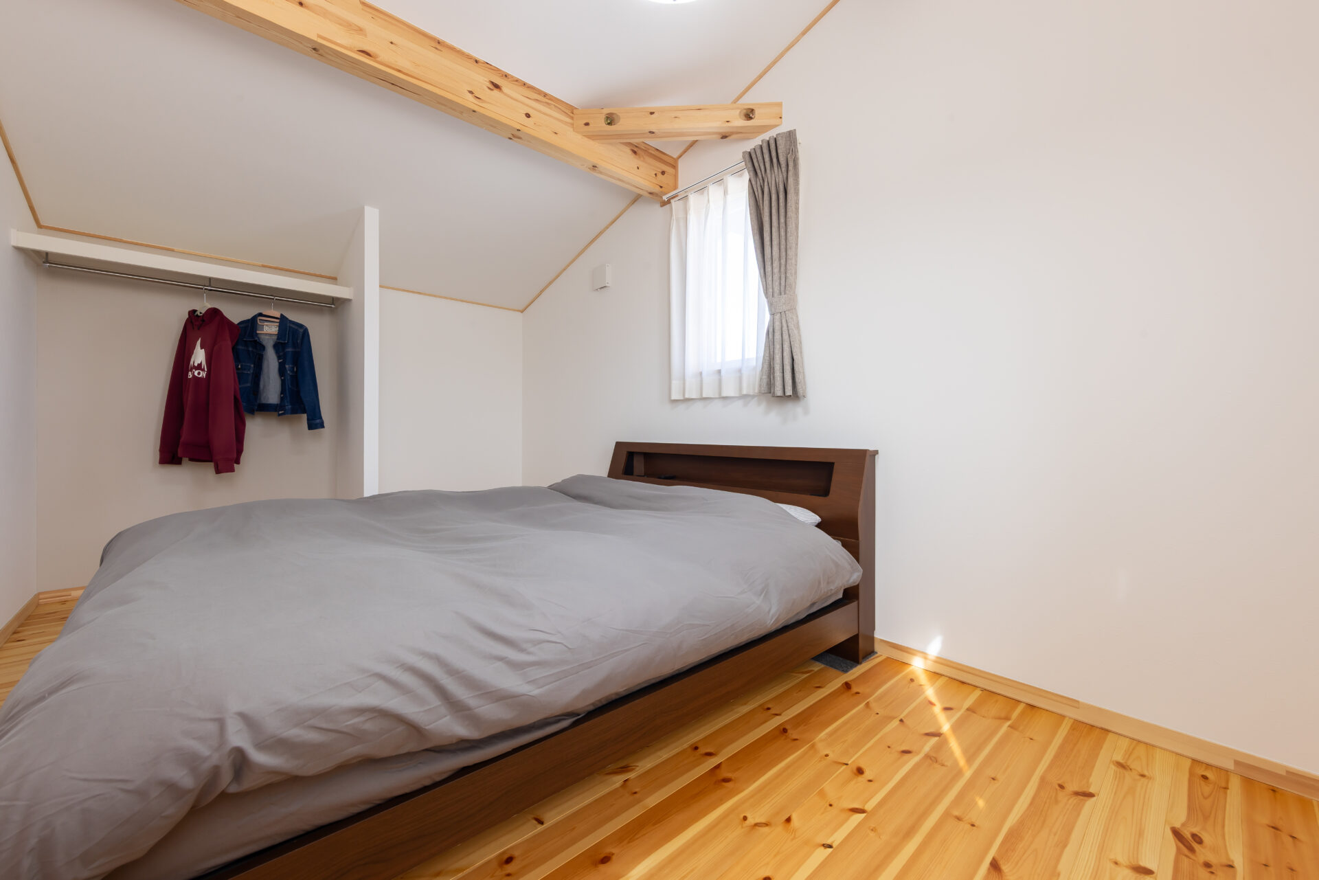 2階のフリースペースにはアクセントとなる三連窓を配置。有孔ボードを使ったアウトドアギアの収納スペースは、DIYで仕上げた。「そのため、勾配天井の一部をフラットにしてもらっているんです」とご主人。ショップのディスプレイのような”見せる収納”は、準備はもちろん片付けもラクラク