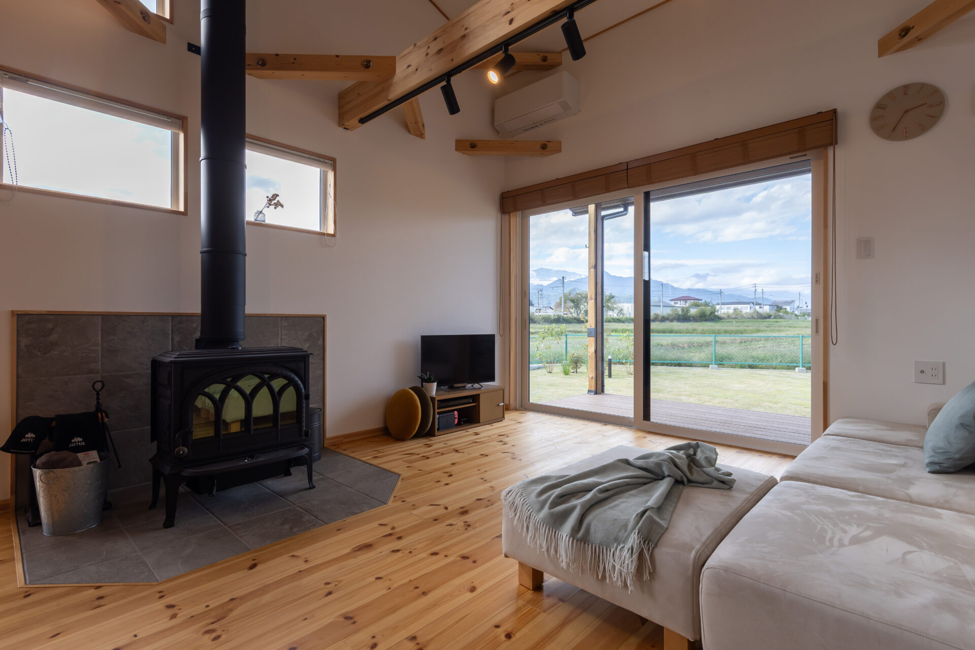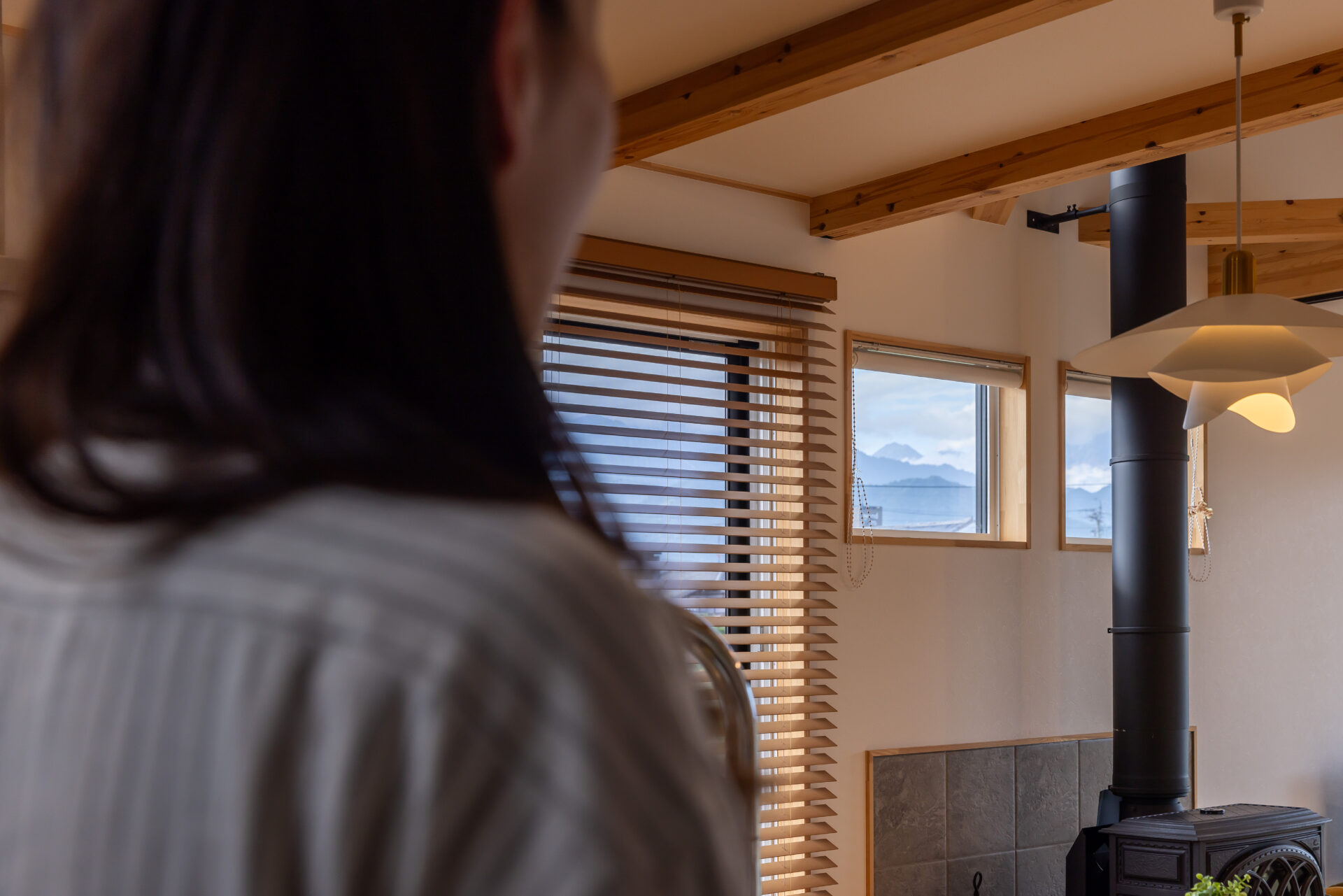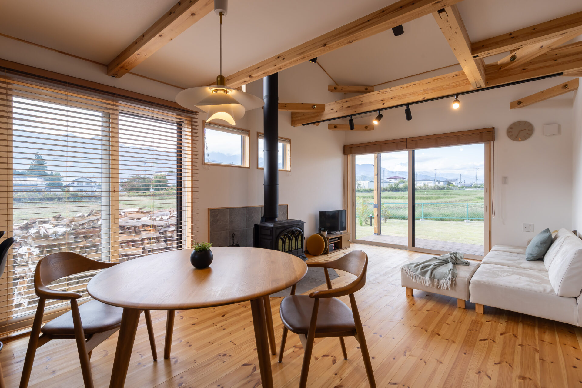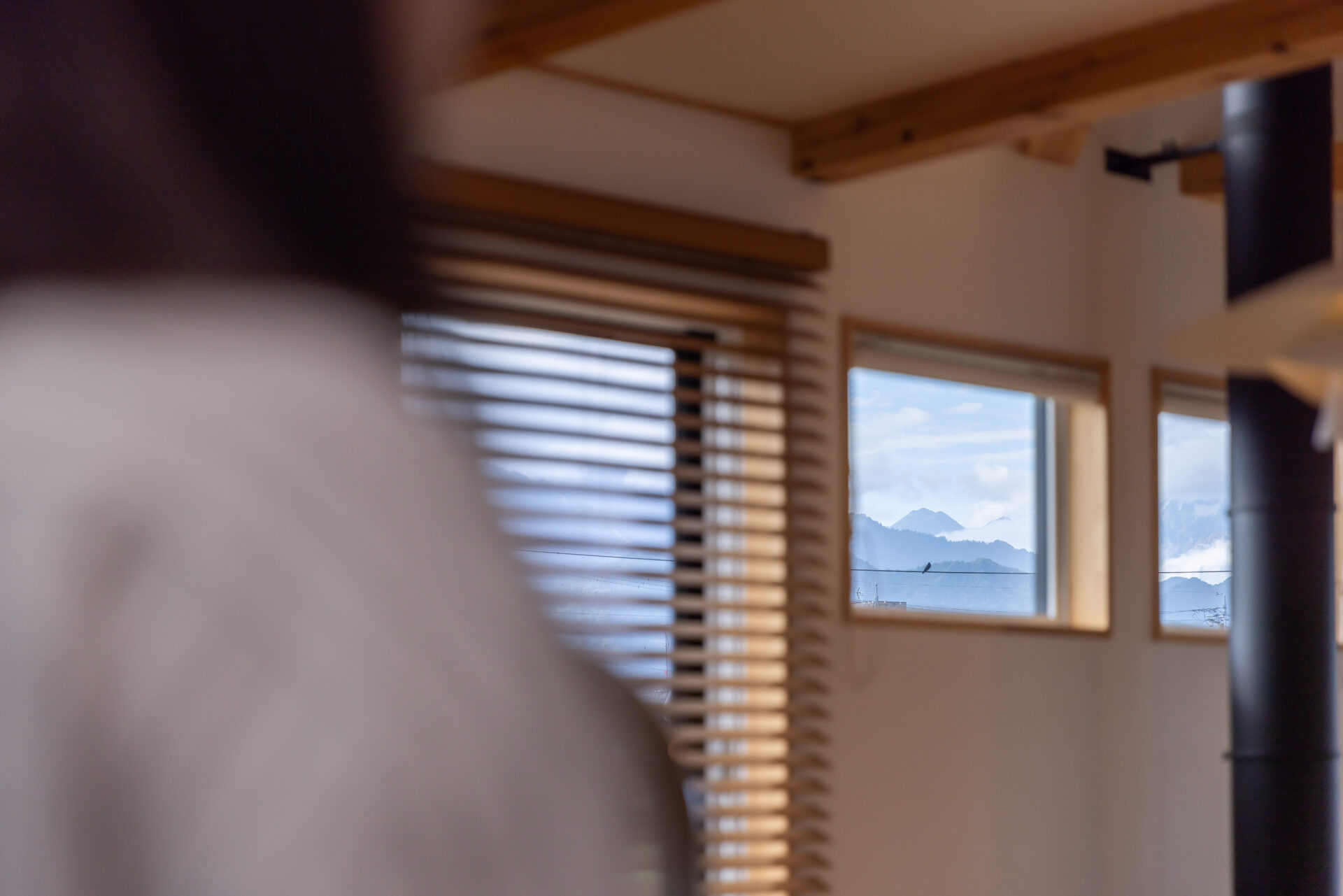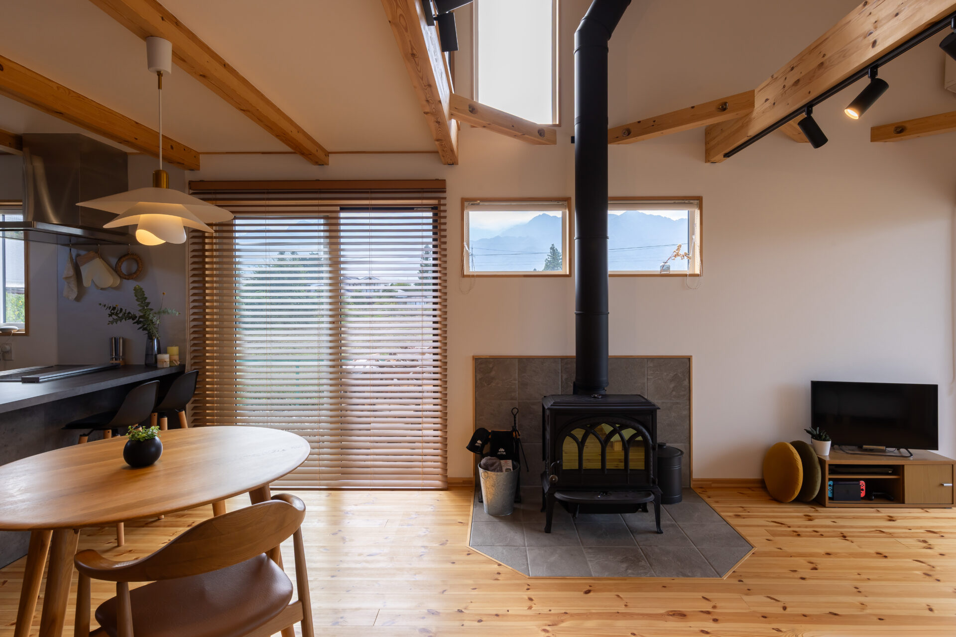 北と西に設けた大きな開口からは、北アルプスの山並みが飛び込んでくるよう。LDK北側は吹き抜けになっており、開放感が際立つ。「キレイな眺めに存分に浸るため、窓の掃除をこまめにするようになりました」