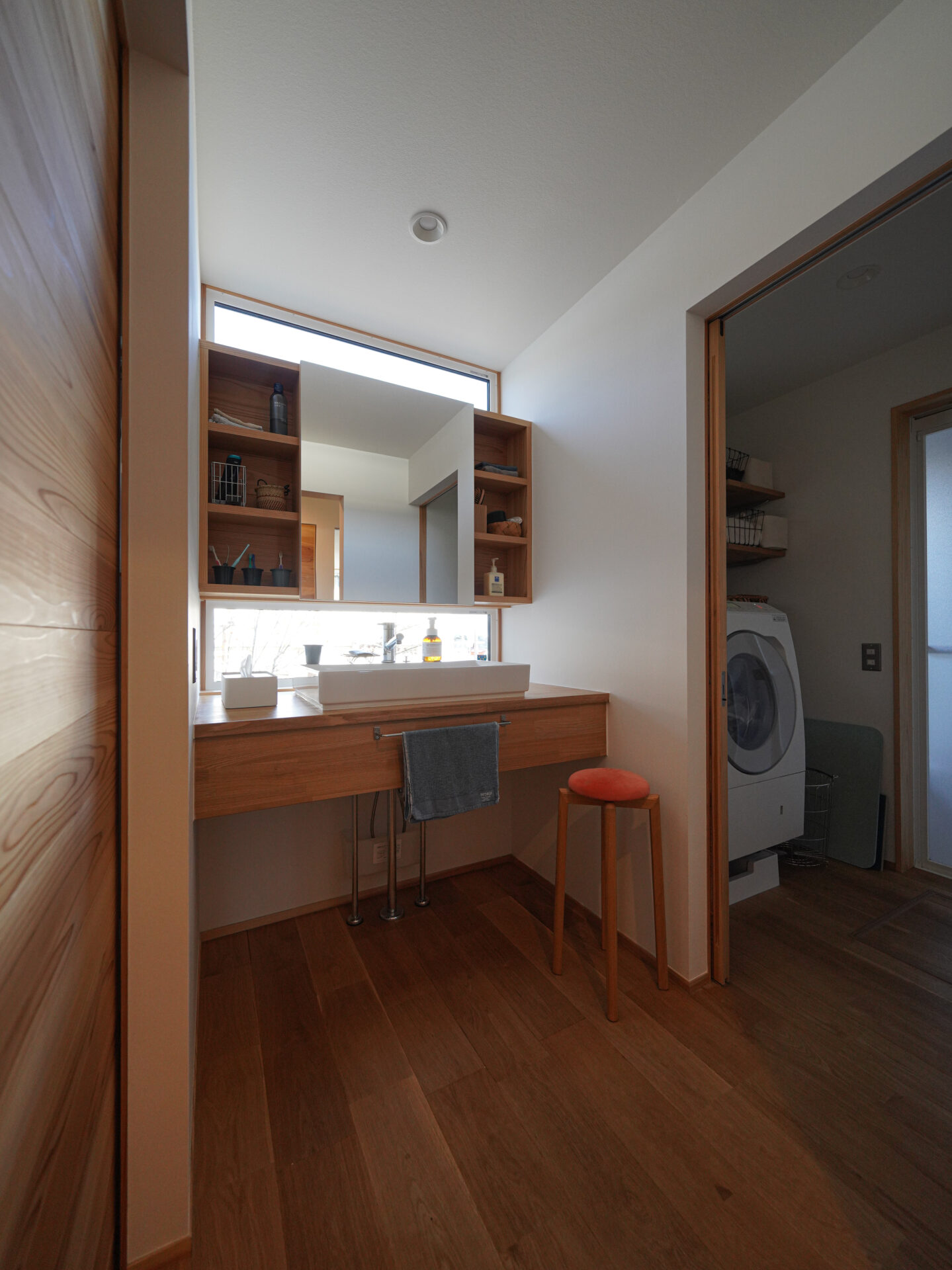 →板張り勾配天井と関節照明が心地いいリビング、店舗の造作カウンター、棚背面まで板張りにこだわった造作洗面です。