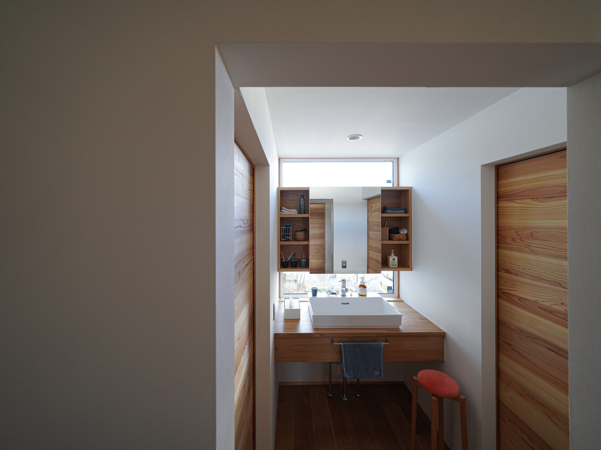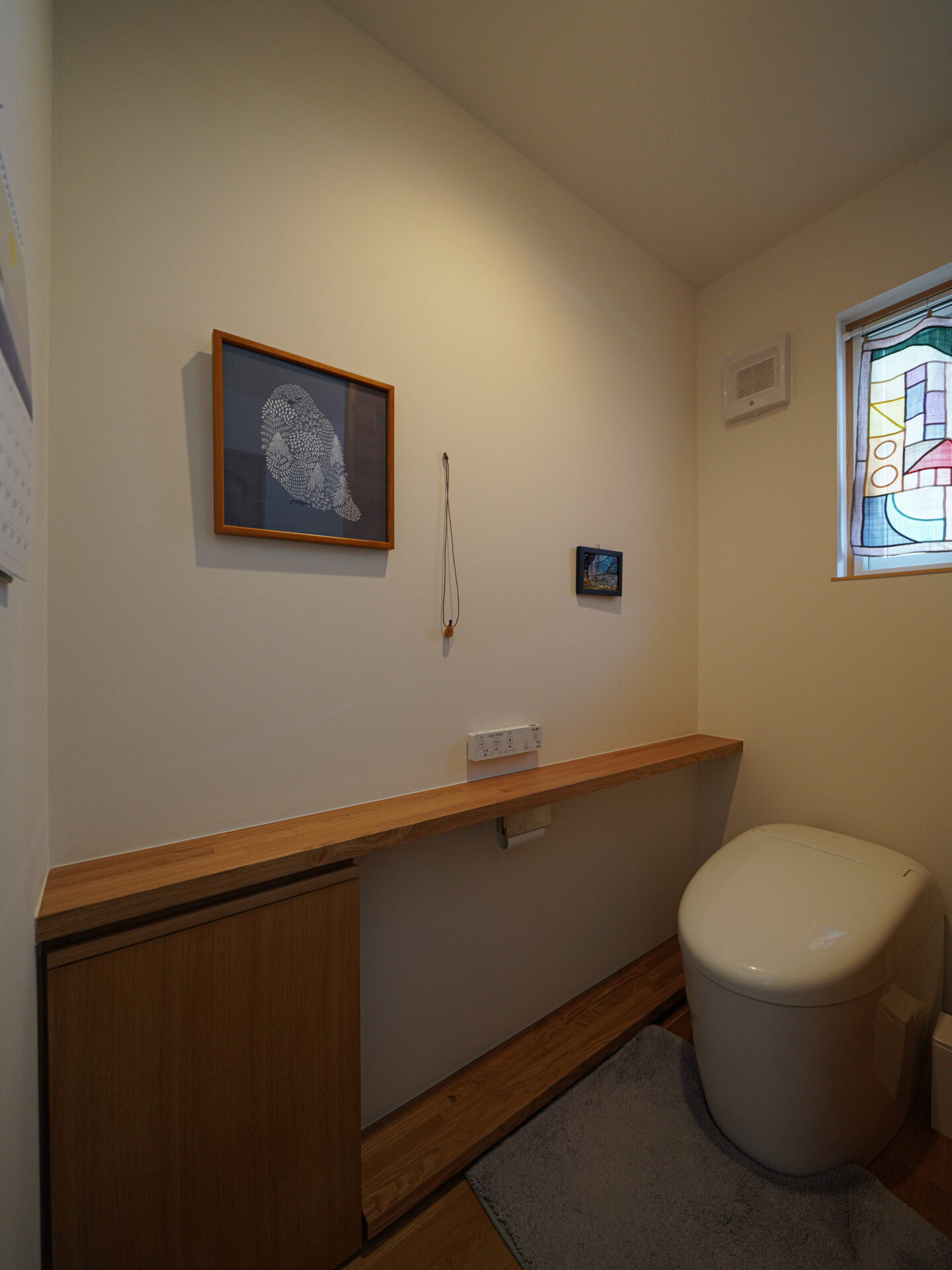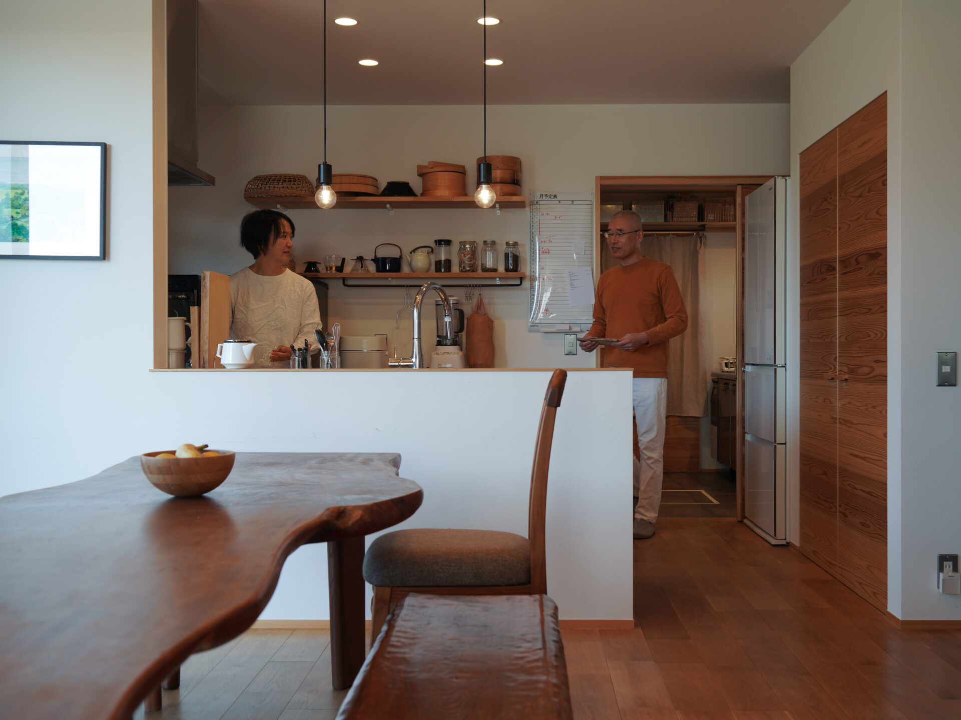床材はオークの無垢フローリング、壁は漆喰、リビングダイニングの天井は無節のスギ板張りと、Nさんが希望した自然素材もまた空間にぬくもりをもたらし、居心地をよくしています。加えて、キッチンやトイレ、脱衣室にまで無垢のフローリングを採用したのも、Nさんの要望から。「お風呂上がりの素足にとてもきもちいいんです。夏は大人も裸足で過ごしていますよ」
