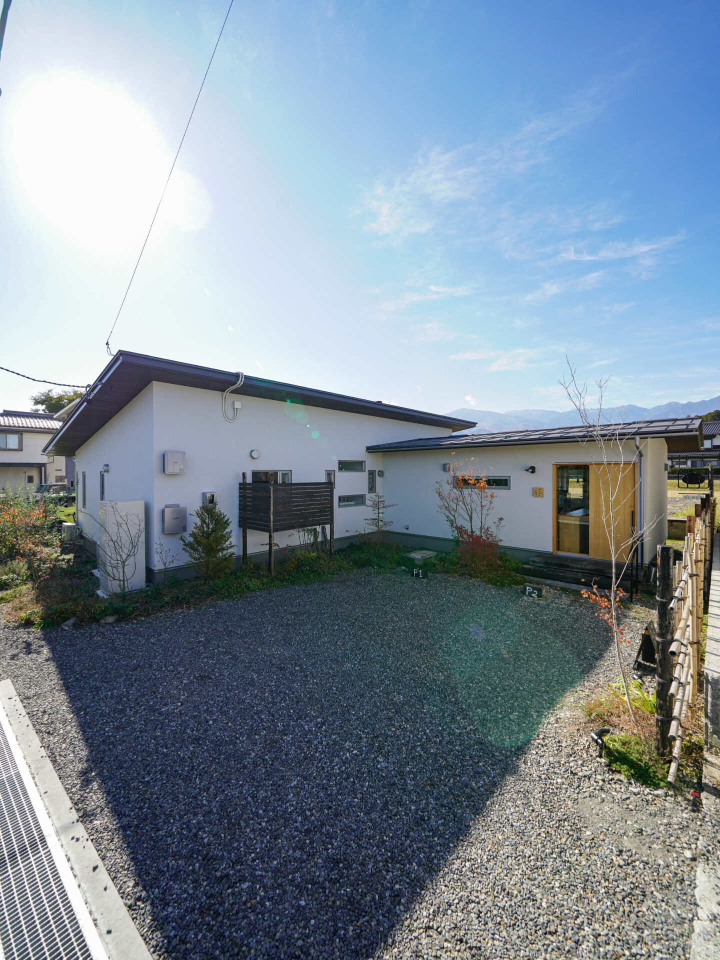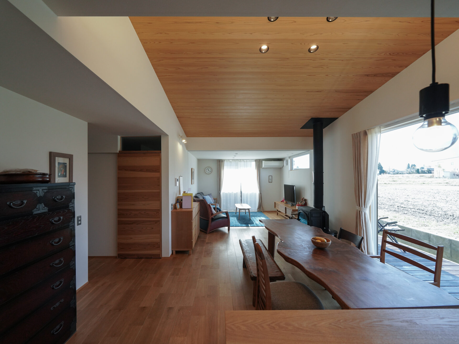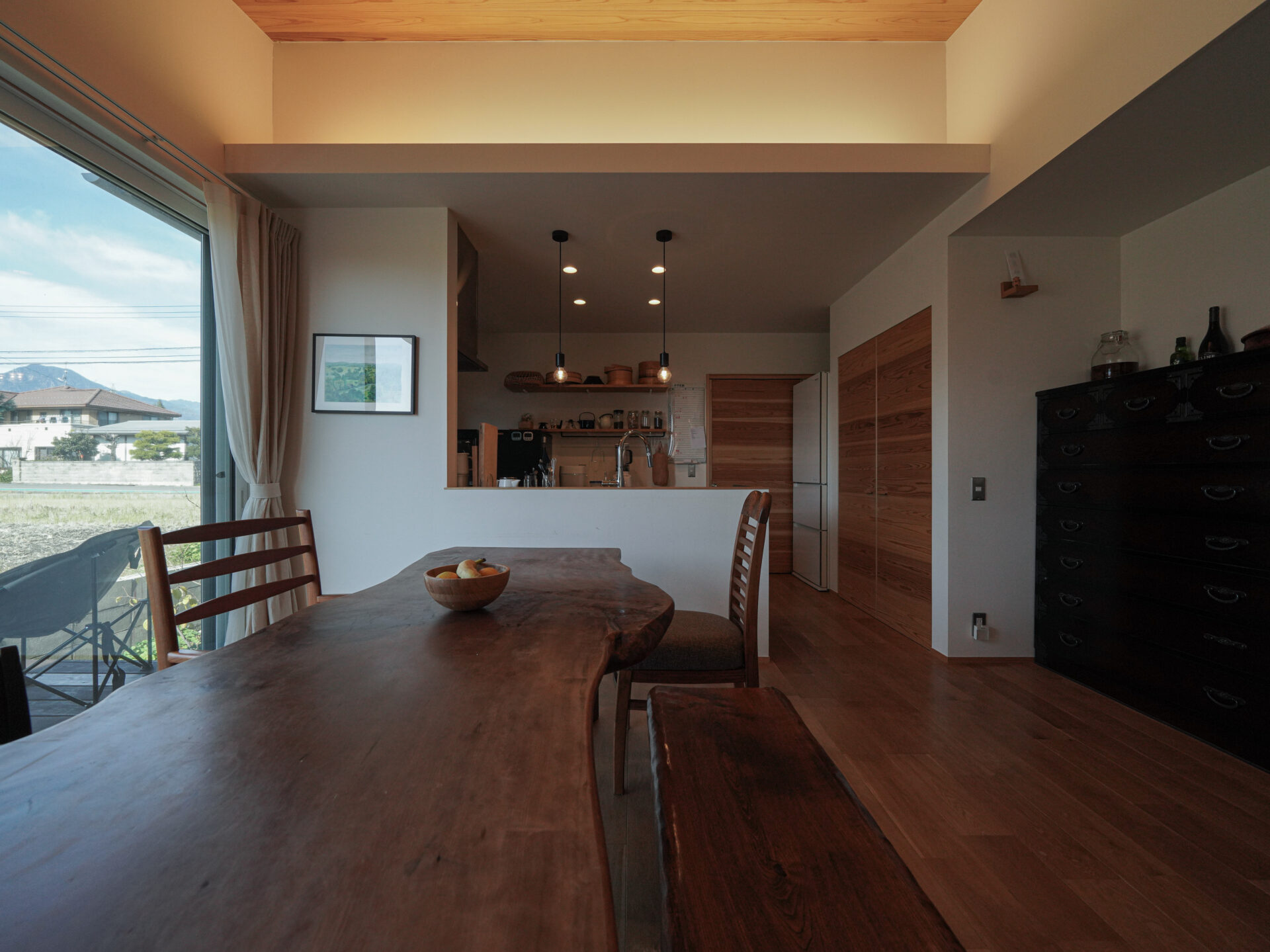 ゆとりのある敷地に、動線に無駄のない平屋をプランニング。目の前が田んぼというロケーションを最大限に生かして、家族が集うダイニングの西側には大きな掃き出し窓を。